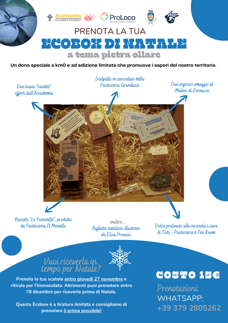 Il progetto Ecobox, nato nel dicembre 2021, mira a sostenere le realtà commerciali e i produttori dei nostri piccoli borghi montani, incentivando l’acquisto di prodotti. Quest’anno, la proposta natalizia offre una selezione esclusiva di specialità alimentari, alcune di esse create appositamente per questa occasione e buoni volti alla valorizzazione della realtà museale e associativa di Malesco. Fil rouge sarà la pietra ollare a cui è dedicato l’ecomuseo regionale e materiale principe, presente sul territorio e utilizzato già dall’antichità.