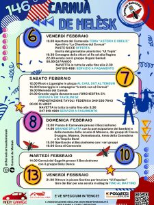 Il programma completo Carnuà di Melèsk è disponibile nella locandina a seguire o sul sito ufficiale carnevalemaleschese.it
