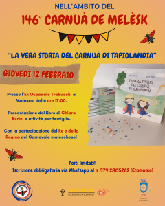 Giovedì 12 febbraio l’Ex Ospedale Trabucchi ospiterà un appuntamento speciale dedicato al Carnevale. A partire dalle ore 17.00, il pubblico è invitato a partecipare alla presentazione del libro di Chiara Berini, ex Regina del Carnevale maleschese, che attraverso il suo racconto ripercorre la vera storia del Carnuà di Tapiolandia.